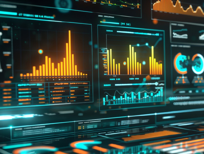 The hologram screen displays big data visualizations, analytical charts and key performance indicators