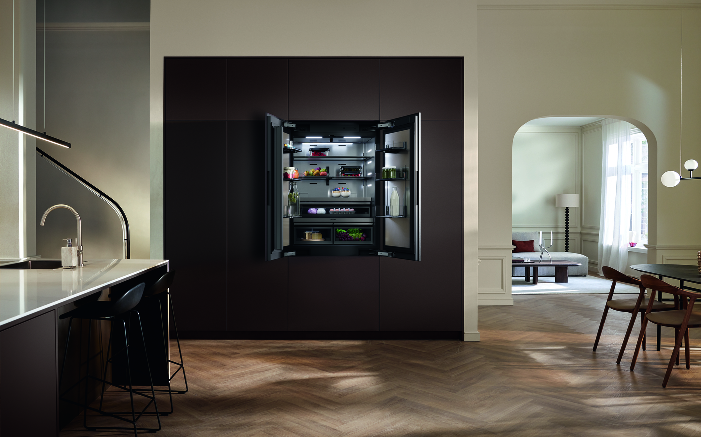 MasterCool III also features an odor-filtering system and built-in cameras. In addition, with the new MasterFresh Pro system, food stays fresh longer. Rounding out the features is the DailyFresh ExtraCool drawer, ideal for delicate food such as meat, fish, or dairy products. Finally, the Longlife AirClean System, with an activated carbon filter, neutralizes unpleasant odors in the refrigerator. As for connectivity, thanks to Miele@home, all models can be connected.
